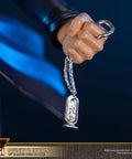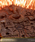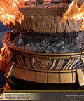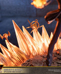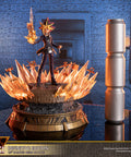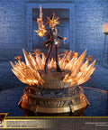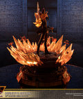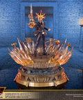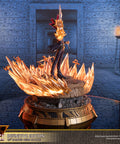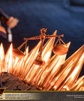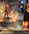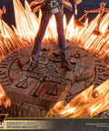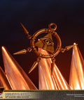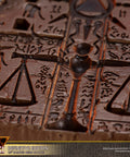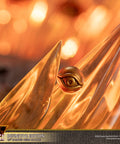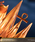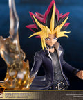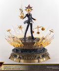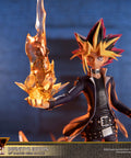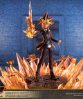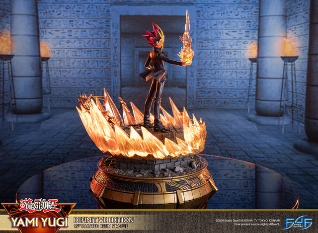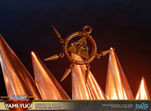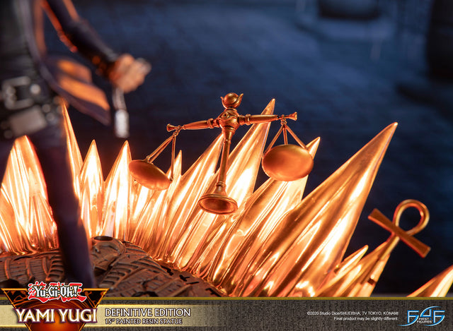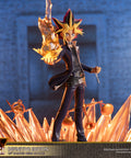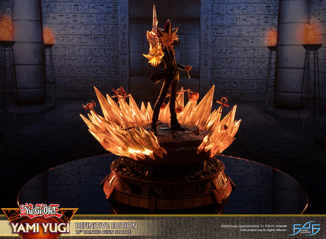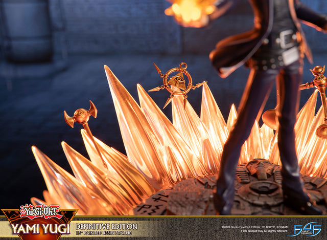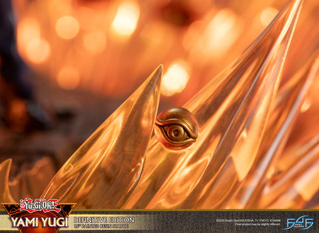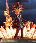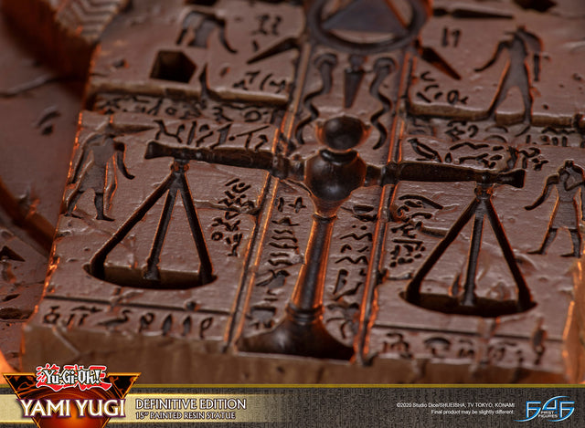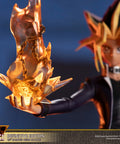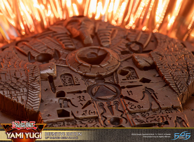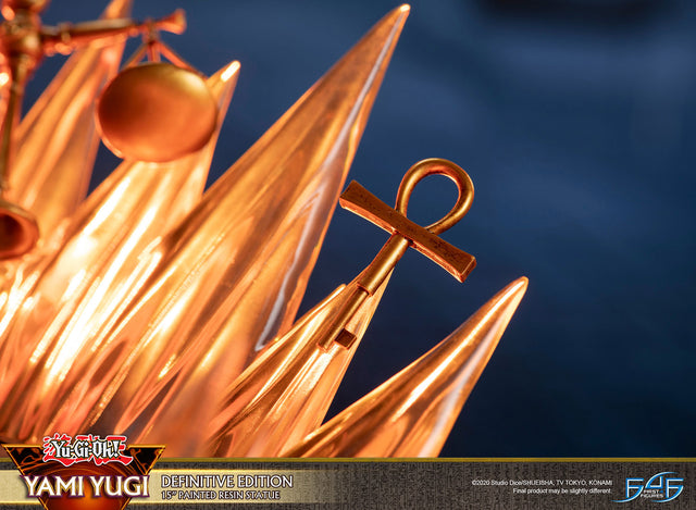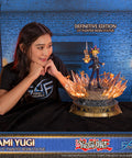 The Definitive Edition comes with LED light-up functions on the transparent yellow energy effect and an interchangeable left hand for Yami Yugi, holding a cartouche. This edition features a larger resin base resembling the Shrine of the Millennium Stone, where Yami Yugi uses all the Millennium Items to separate himself from Yugi for their final duel. The base is enveloped by transparent yellow energy effects with LED light-up functions. The Millennium Items encircle the base, appearing to float within the radiating energy.