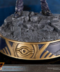 The statue meticulously captures Yami Yugi's iconic features, from his tri-colored hair and piercing gaze to his Domino High uniform with a closed, buckled collar. He is portrayed standing confidently with his right hand holding a Millennium Puzzle, with a transparent yellow energy effect emanating from it. The underbase is adorned with the golden Eye of Anubis against a blue background.